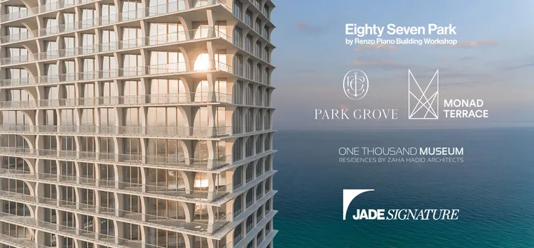 In Surfside, the 18-story Eighty Seven Park, set in lushly landscaped North Shore Park and designed by world-renowned Pritzker Prize winner Renzo Piano, features a rounded design that will "create a fresh dialogue" with its seaside environment. Best known for his poetic approach to architecture, as evidenced in his design for the Whitney Museum and the New York Times Building in New York City, as well as the famed Shard Tower in London, Eighty Seven Park houses 70 luxurious residences ranging in size from 1,018 to 7,572 square feet, and asking $1.6 to $15.5 million.