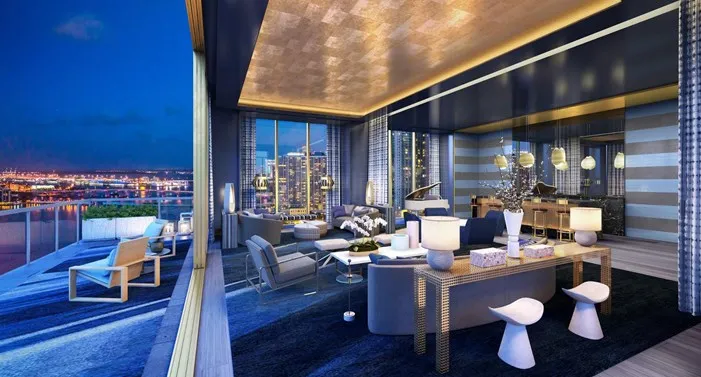 The 30th floor Sky Level deck features the building's Grand Salon lounge and bar area, Grand Dining Room with seating for up to 24 guests, catering facility and chef's table, library, private screening room, plus media room.