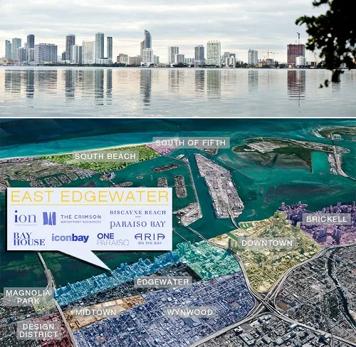 Photo credit: Edgewater - online.wsj.com, Map - ionmiamicondos.com