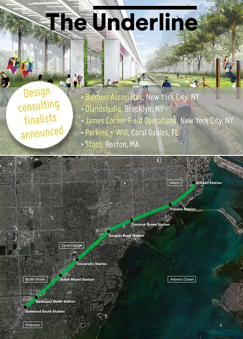 Five design teams have reached the final round for the final designs of the Underline, a scenic 10-mile bike path and park located south of downtown Miami underneath the Metrorail tracks.