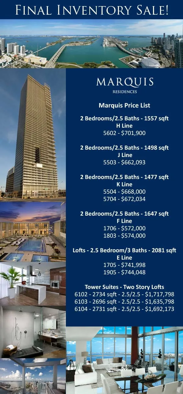 We keep you updated about the current prices. This is your chance to own a unit in the amazing Marquis Condo!