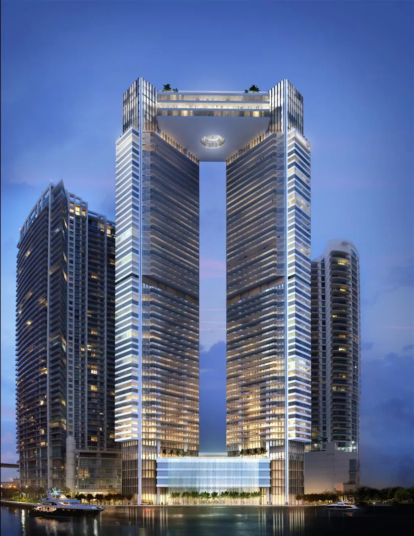 One River Point twin towers, adjoined at the top, will house a sky club with a few restaurants, a screening room, and a cigar lounge. Club membership will be open to the public.