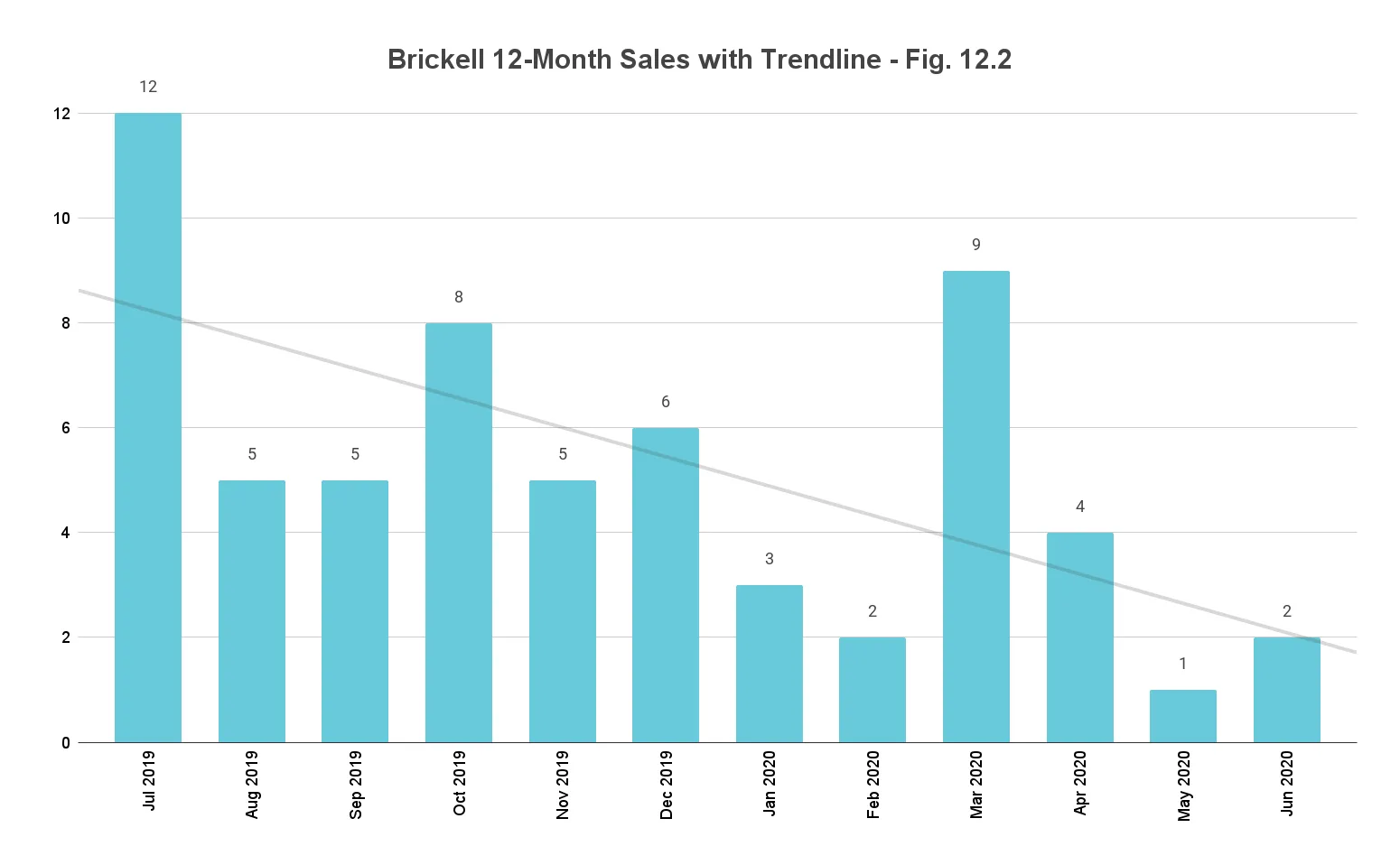 78.1% drop in year-over-year Sales with negative trendline. With the biggest percentage drop in year-over-year sales of all the neighborhoods in our study, Brickell bears the maximum impact of a COVID-related loss in momentum. Declining a considerable 78.1% against the same quarter last year (fig. 11), the 12-month trendline also stays negative between 1Q20 and 2Q20.