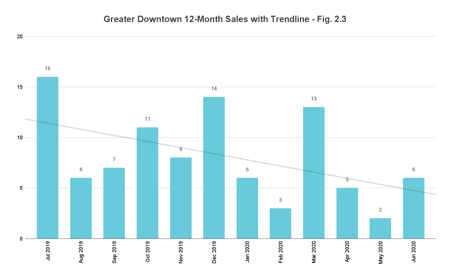 67.5% drop in year-over-year Sales with negative trendline. Absorbing the full impact of the global health crisis, this Greater Downtown grouping posts a 67.5% decrease in year-over-year Sales -- in-step with the overall Miami market (fig. 1). While a slowdown was expected due to the lockdown of March and April, a more than 50% drop in a second quarter, which is usually the strongest of the year, suggests that the GDM luxury condo market could take a while to recover. This is further substantiated by the 12-month trendline (fig. 2.3) staying negative between Q1 and Q2 this year.