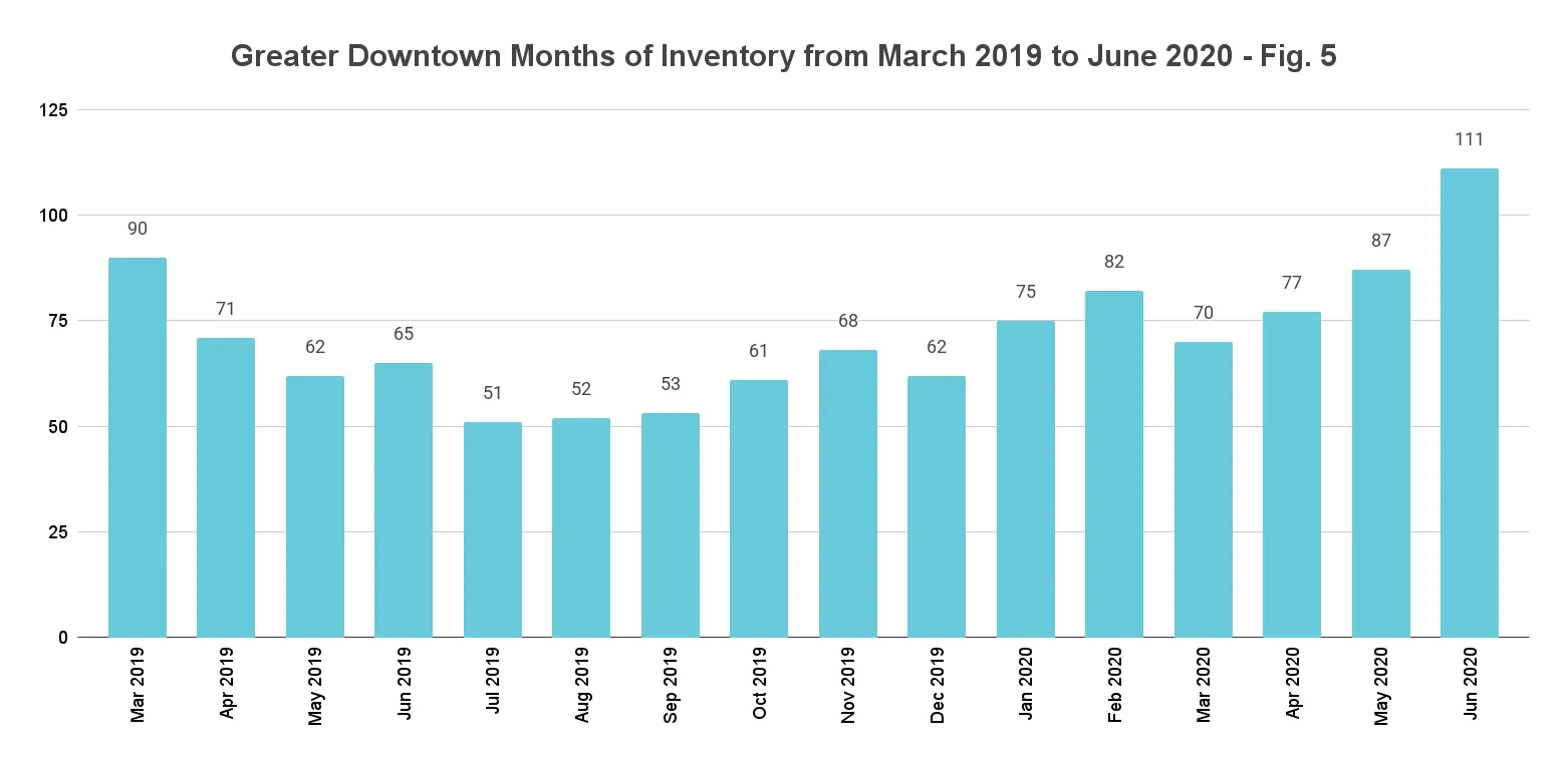 2Q20 closes with 111 months of Inventory. Consistent with the overall market trend in Miami, Greater Downtown's luxury condo inventory increased 70.8% year-over-year, going up from 65 months last June to 111 months this year (fig. 5). On a quarter-to-quarter basis, inventory was up 58.6% from March's closing of 70 months.