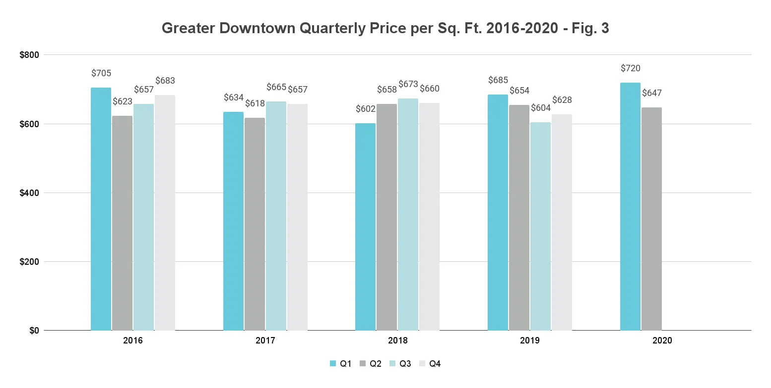 Price/sq. ft. stays flat year-over-year at $647. Deviating from the overall market trend of increasing prices, the Median Price/Sq. Ft. posts a marginal decline of 1%, keeping the price mostly flat, going from $654 in the same quarter last year to $647 this year (fig. 1). On a quarter-to-quarter basis, however, luxury condos posted a decrease of 10.1%, down from $720 in 1Q20. It's also worth noting that the median price per sq. ft. trended in the mid-ranges of the quarterly prices traced over the past four years (see fig. 3 below).