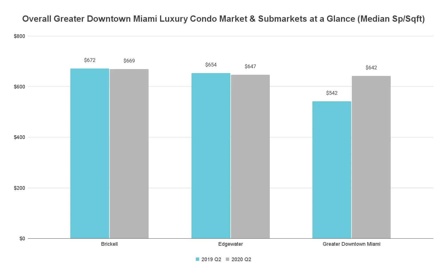 Price/sq. ft. flat at $669, Median Price increases 2.3% year-over-year. Partly deviating from the general market trend, Brickell reported a flat Price/Sq. ft. with increased Median Sales Price compared to an increase in both metrics in the overall report.