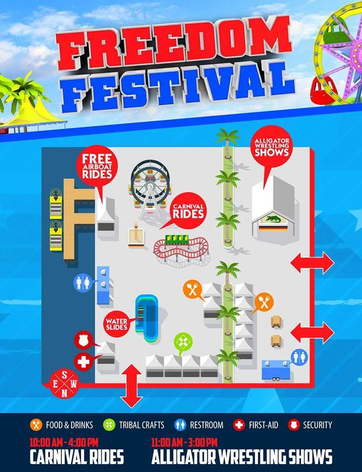 At this free carnival, you and your family can spend Independence Day taking turns on carnival rides and cooling off on water slides. Enjoy an airboat ride or watch an alligator wrestling show. Vendors even have food and beverages along with Native American arts and crafts from the Miccosukee Tribe for the complete experience.