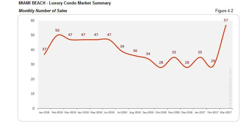 - South Beach’s March sales leaped 88% over February’s numbers. Pretty much in tandem with the overall luxury condo sales situation (fig. 1.1).