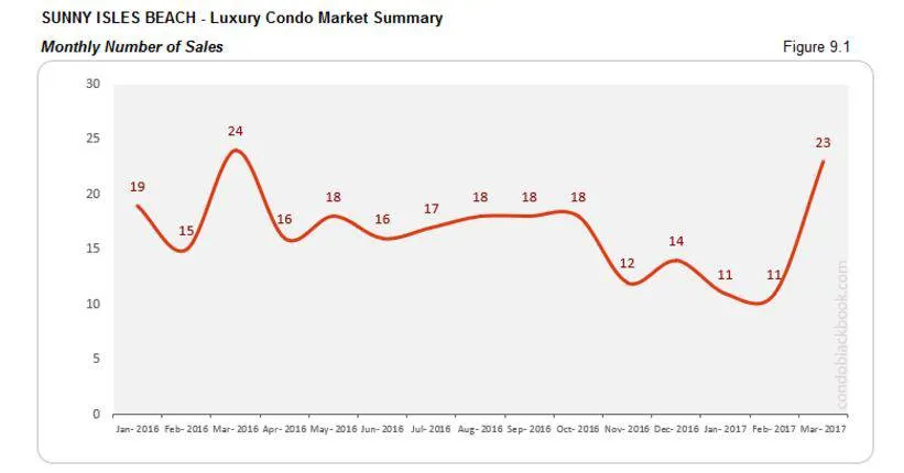 - Sunny Isles Beach follows the overall sales trend visible throughout this report. Posting a quiet January and February and then showing a sudden recovery in March (fig. 9.1).