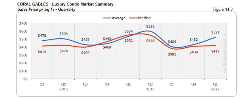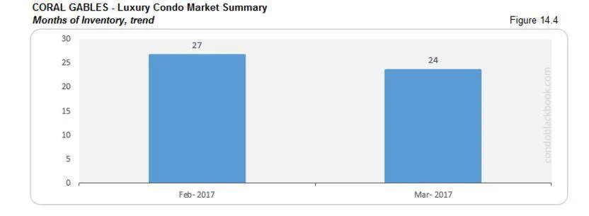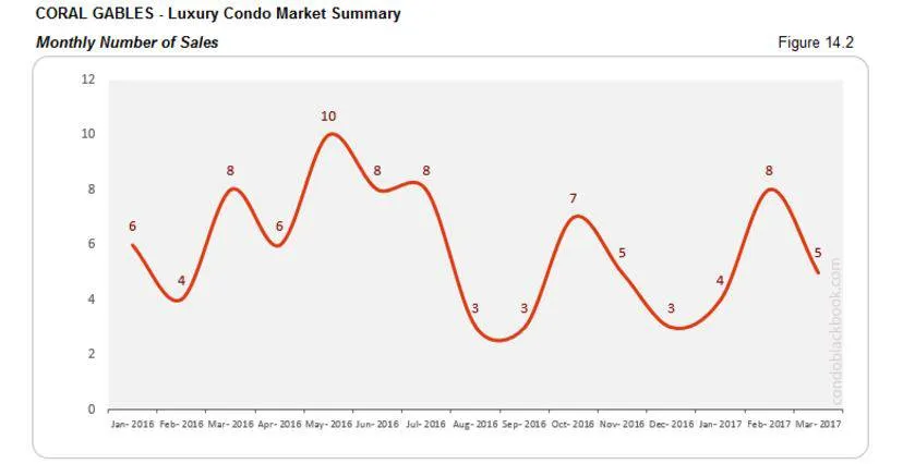 - Again, Coral Gables is a rather quiet neighborhood when it comes to luxury condo deals, so it may not always be reflective of overall trends – like its sales peaked in February rather than March (fig. 14.2).