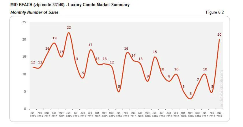 - The big peak that we see in the sales volume for the overall market summary is also present here in Mid-Beach, going from 5 to 20 sales in just one month (fig. 6.2).