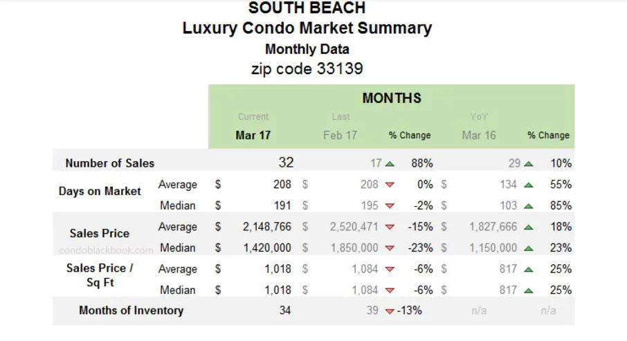 - South Beach has 34 months of luxury condo inventory. There are currently 700 active luxury properties and 33 pending, and an average of 22 deals per month (last 6 months’ average).
