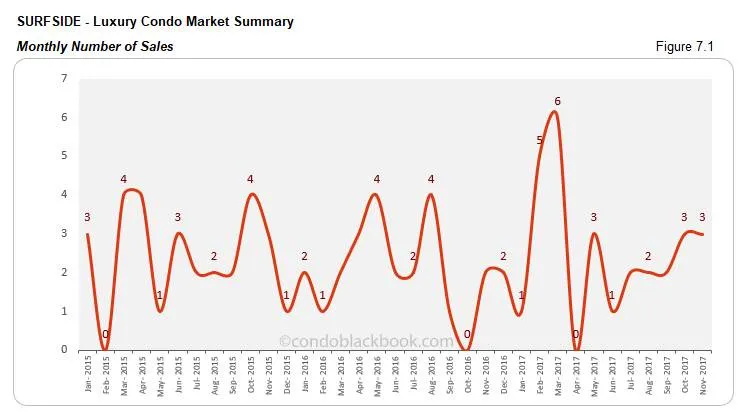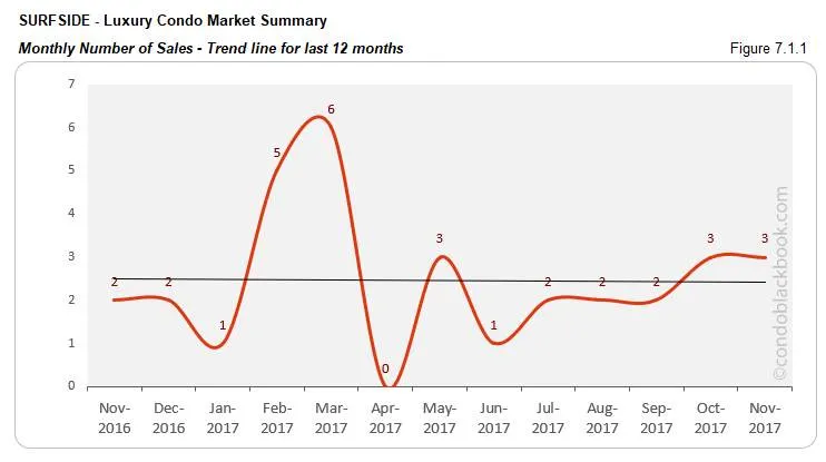 - No change in sales, trend line hovers. Condo sales in November match last month, posting zero changes for Surfside. We also see a 50% increase year-over-year. However, we still notice the trend line tip slightly this month (fig. 7.1.1). Considering Surfside is a small market for luxury condos, high volatility is expected of the metrics.