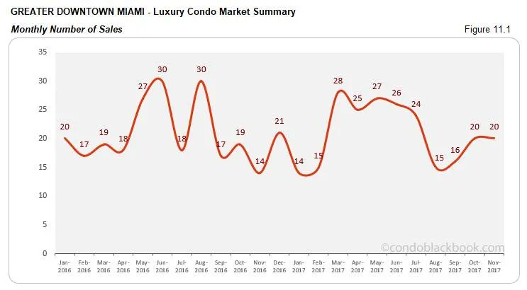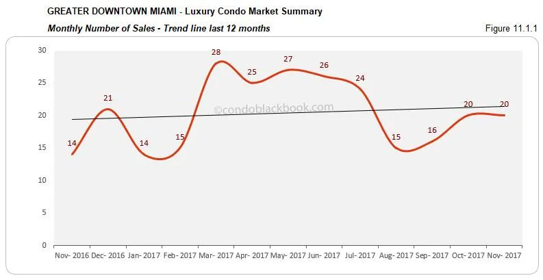 - Sales improve year-over-year with a positive trend line. The Greater Downtown Miami area reports a positive sales scenario this November. While there is no change in the monthly numbers, we see a 43% increase over last year. We also see a positive trend line in fig. 11.1.1 below, which shows that this dynamic neighborhood is keeping the progress it has made so far.