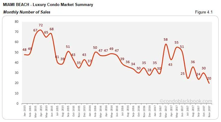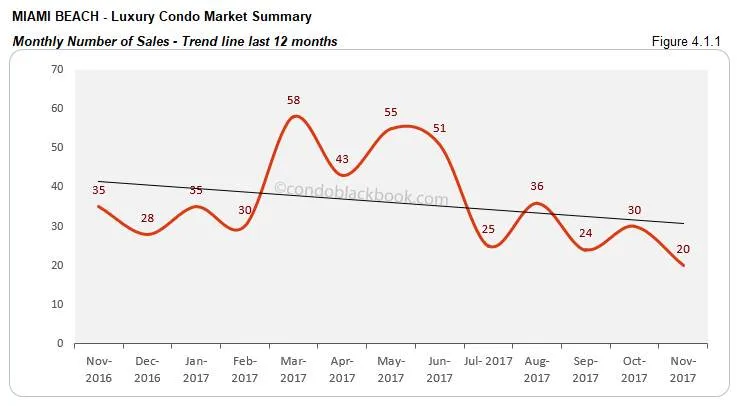 - Expected dip in sales and trend line. After last month’s uptick, Miami Beach condos have lower sales to report for November. This decline is quite expected during the last quarter. We have November closing with 33% lower sales than last month and 43% below the same month last year (fig. 4.1). Even the 12-month trend line echoes this downward trend (fig. 4.1.1). But, with the arrival of Art Basel crowd and snowbirds spending winter on the beach, we expect a strong closing to 2018.
