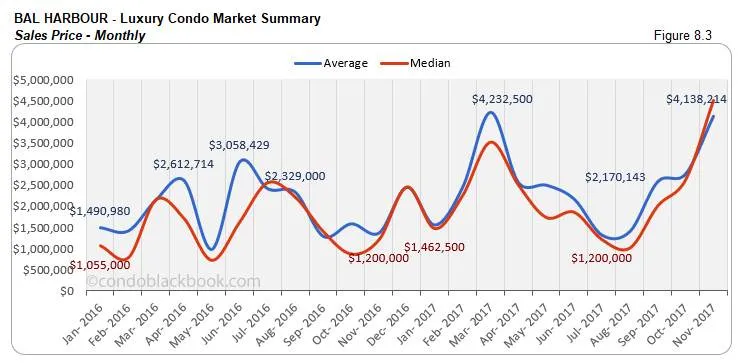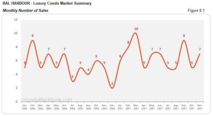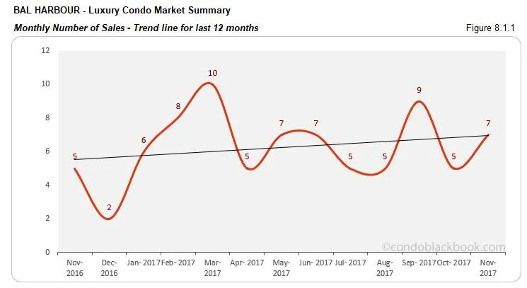- Sales post uptick with positive trend line. Bal Harbour is one of the few neighborhoods in our study to report positive sales this month. The numbers are 40% higher compared to last month and same time last year. This helps the trend line in fig. 8.1.1 maintain its positive stance.