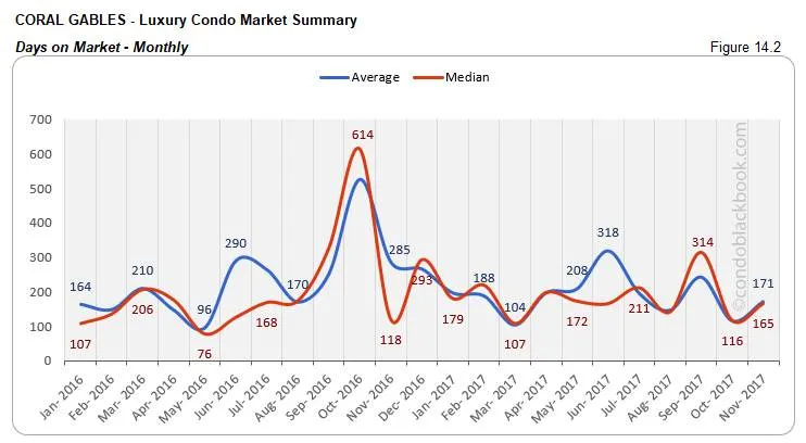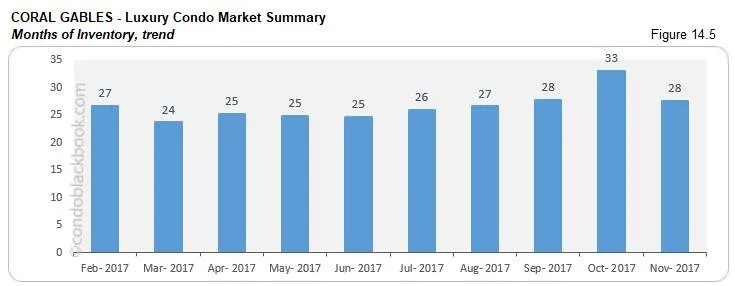 - Months of inventory drop 16%. Fig. 14.5 reports 28 months of inventory in Coral Gables (108 active listings + 18 pending, divided by an average of 5 deals a month). This is again off the 9-12 month mark of a balanced market. With ample variety sitting on the market, buyers could gain by checking out the lifestyle options in Coral Gables, or directly search Coral Gables condos for sale here.
