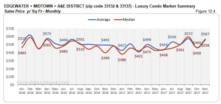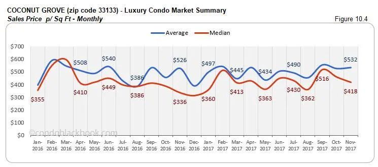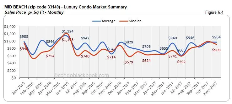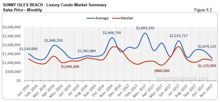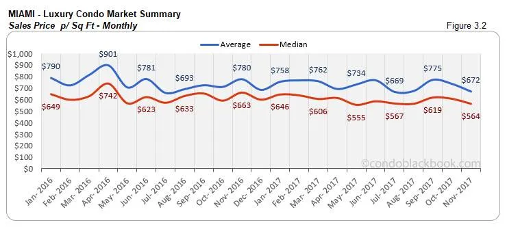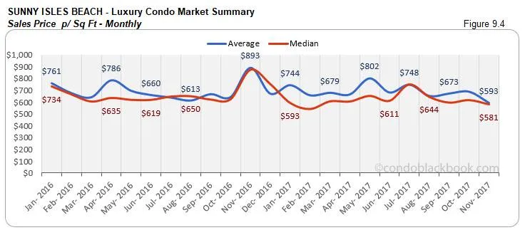 - Prices adjust lower. Even though Sunny Isles Beach had a single ultra-luxury sale (above $2 million) to report this month, we see the prices decline. The median price is down 5% since October and the price per sq. ft. is also down 6%. (See fig. 9.3 and 9.4 below.)