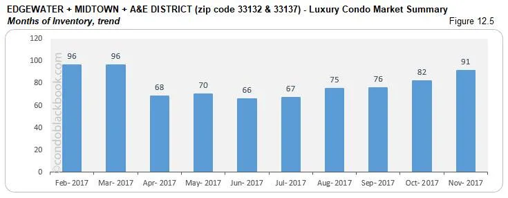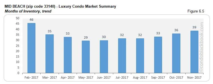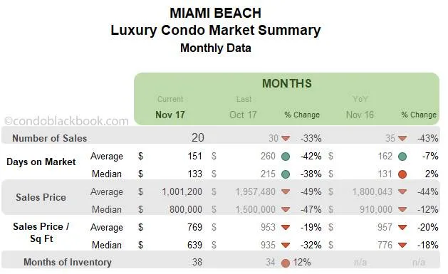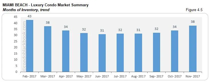 - Inventory nudges up 12%. Miami Beach reports 38 months of condo inventory in November below (1245 active listings + 71 pending divided by an average of 34 deals a month). This metric has again moved further away from the 9-12 months of a normal market, giving buyers greater power while shopping for Miami Beach condos for sale here.