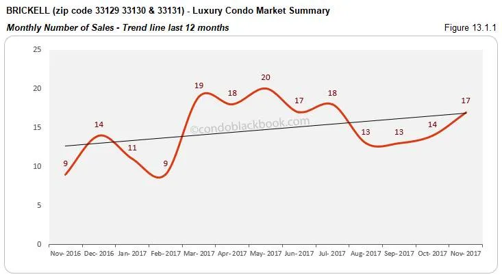 - Sales pick up pace and so does the trend line. November closes 21% higher than October and 89% higher compared to the same month last year. This a great sign for the financial district. Even the trend line in fig. 13.1.1 soars higher. Again, this boost is owing to sales mostly in the luxury segment ($600,000 to $2 million), since ultra-luxury sales (above $2 million) remained limited here.