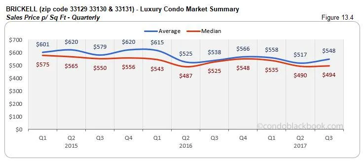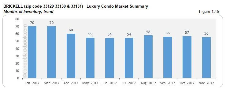 - Months of inventory decrease 2%. Fig. 13.5 reports lower months of inventory at 56 (866 active listings + 22 pending listings divided by an average of 16 deals a month). This is still much higher than the 9-12 months of a balanced market. With ample choices on hand, buyers should take a look at Brickell’s lifestyle options or directly search Brickell condos for sale here