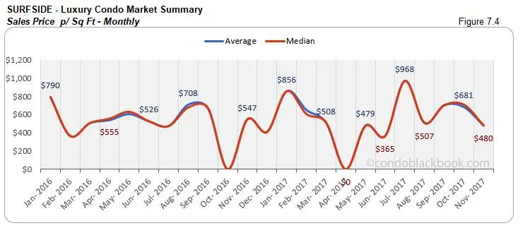 - Prices post a sharp decline. We see a drastic drop in prices for this neighborhood. The median price is down 45% month-on-month and 36% year-over-year. Even the price per sq. ft. is 32% lower compared to October and 12% less year-over-year. (See fig. 7.3 and 7.4 below.) Again, since Surfside is such a small market, a few condo sales on the lower end of luxury or ultra-luxury can sway the numbers drastically one way or the other.