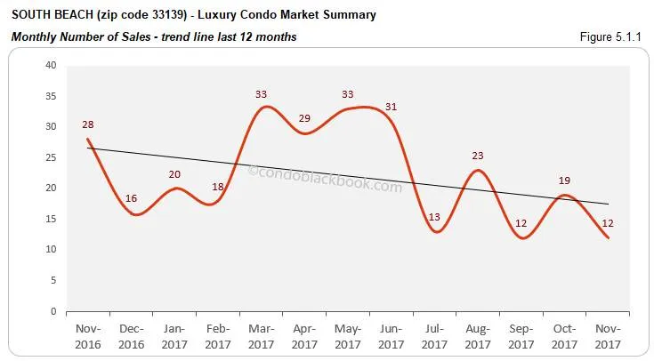 - Sales and trend line take a dive. Sales are expected to be quiet in the last quarter each year, which becomes quite evident in the chart below (fig. 5.1). This time South Beach takes a bigger blow with sales closing at 37% below last month and 57% below same month last year. This also affects the trend line heavily (fig. 5.1.1), making it dip further in November. However, with Art Basel folk and snowbirds flocking it’s sunny shores, we are looking forward to a strong recovery.