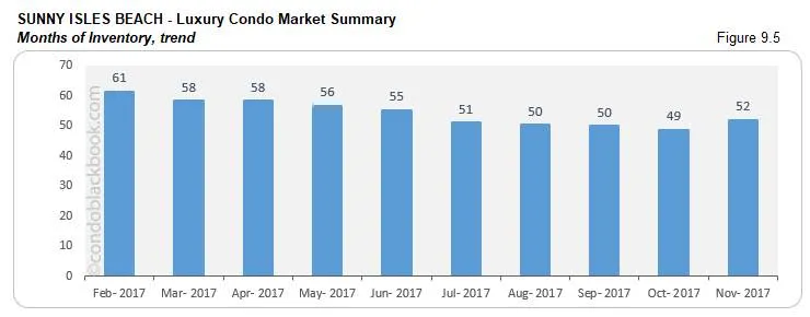 - Months of inventory up 7%. Fig. 9.5 reports 52 months of inventory for the neighborhood (850 active listings + 23 pending divided by an average of 17 deals a month). This is one of the highest inventory levels in our study, and way off the 9-12 month mark of a balanced market. This means buyers still have the leverage to strike good deals by searching Sunny Isles Beach condos for sale here, or can explore the lifestyle of this branded condo corridor here.