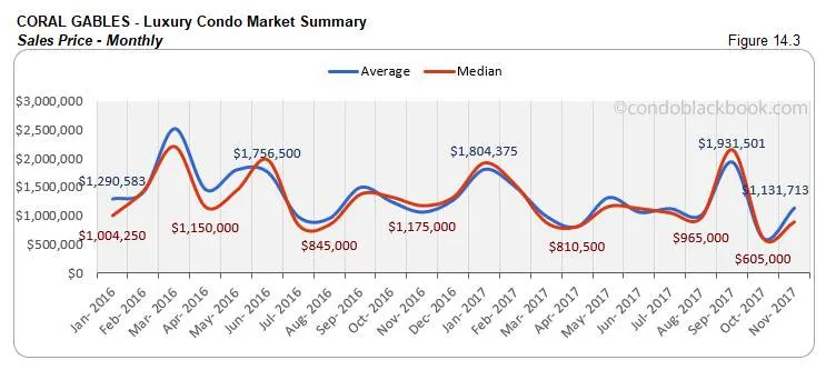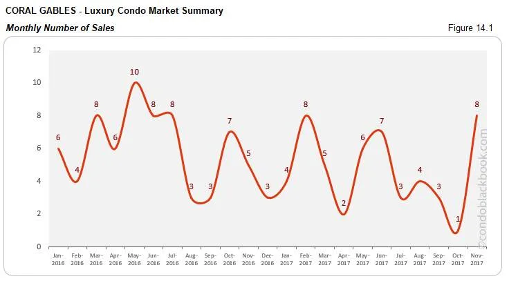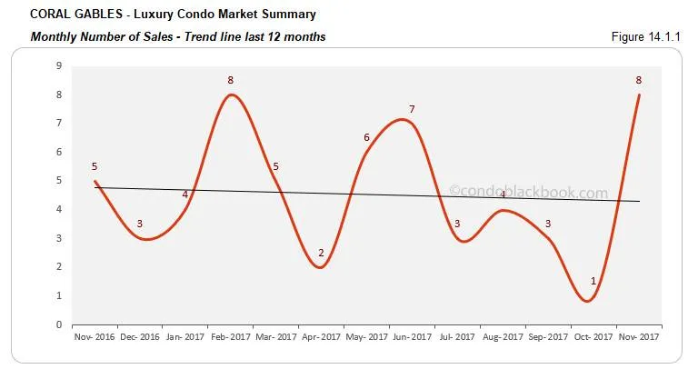 - Record sales post uptick, but trend line descends. For the first time since February, Coral Gables has reported such a strong sales number. It is not only higher than last month, but also same time last year. Since this is a rather small and volatile market, the metrics above show drastic changes in percentage. However, November’s fantastic performance still could not save the trend line from tipping downward in fig. 14.1.1.