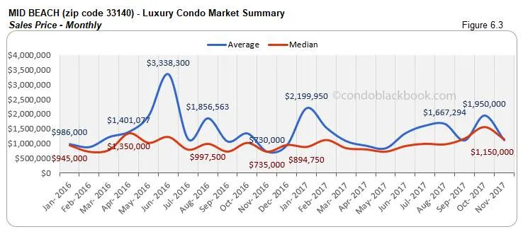 - Sales slide slightly along with trend line, but improve year-over-year. We see a slight decline of 17% in the sales numbers this November. However, Mid-Beach posts an increase of 67% year-over-year. Still, this does not stop the trend line from tipping downward in fig. 6.1.1 below. Hopefully, a strong winter will give this family-friendly neighborhood the push it needs.