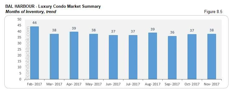 - Months of inventory nudge up. Fig. 8.5 puts the months of inventory at 38 (232 active listings + 11 pending divided by an average of 6 deals a month). This is way off the 9-12 months of a normal market. With plenty of choices on the market, buyers should look into striking a good deal by searching for Bal Harbour condos for sale here or check out this upscale neighborhood here.