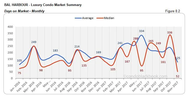 - Days on market post sharp decline. Luxury condos seemed to be moving off the market more quickly as sellers generally have clarity as to the prices buyers are willing to pay. The days on market make a nose dive in the chart below. The median days now stand 63% lower compared to October and 48% lower compared to the same time last year.