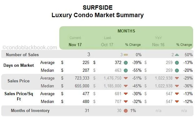 - Inventory stays high, buyers set to gain. Fig. 7.5 reports the months of inventory to be at 31 (69 active listings + 1 pending divided by an average of 2 deals a month). With inventory way off the 9-12 month mark of a balanced market and prices dropping lower, buyers should take a cue and search a Surfside condo for sale here, or see what lifestyle makes up the community of Surfside.