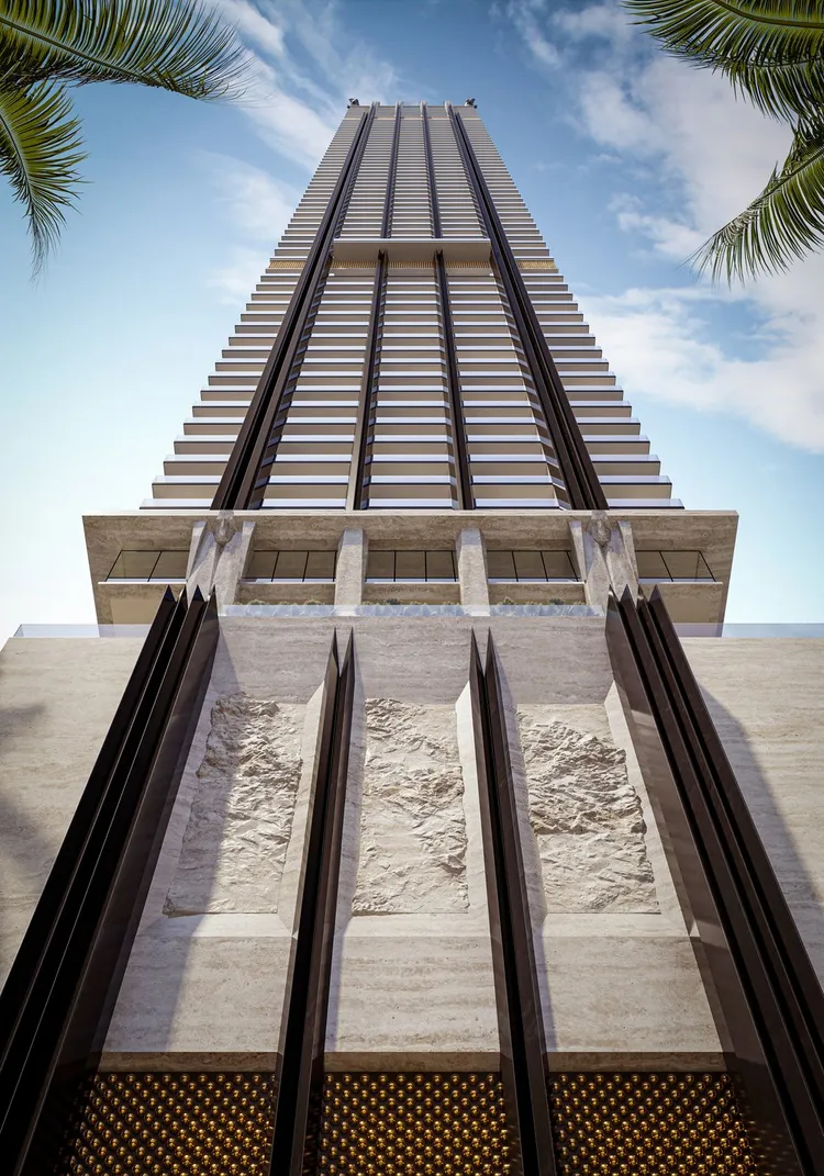 Starting at the porte cochere, the supertall will feature gold leaf trimmings and monolithic slabs of travertine. The crown of the tower will come adorned by a filigree of gold spheres, punctuated by extraordinary sculptures that evoke Italian Futurism. The statement tower will also feature an ivory travertine façade plus high-gloss steel columns to cement its grandeur.