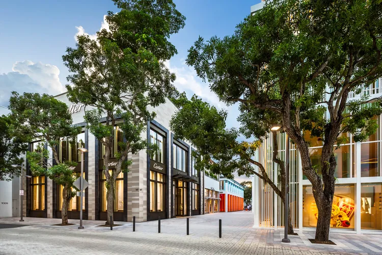 The Miami Design District development project also features a four-block pedestrian promenade with two elegant department stores sporting lush rooftop gardens as its anchors, and mature shade trees keep the streets cool in summer. The design also includes a boutique hotel, condo tower, and five parking garages, with 100% of parking spaces designed to be under cover.