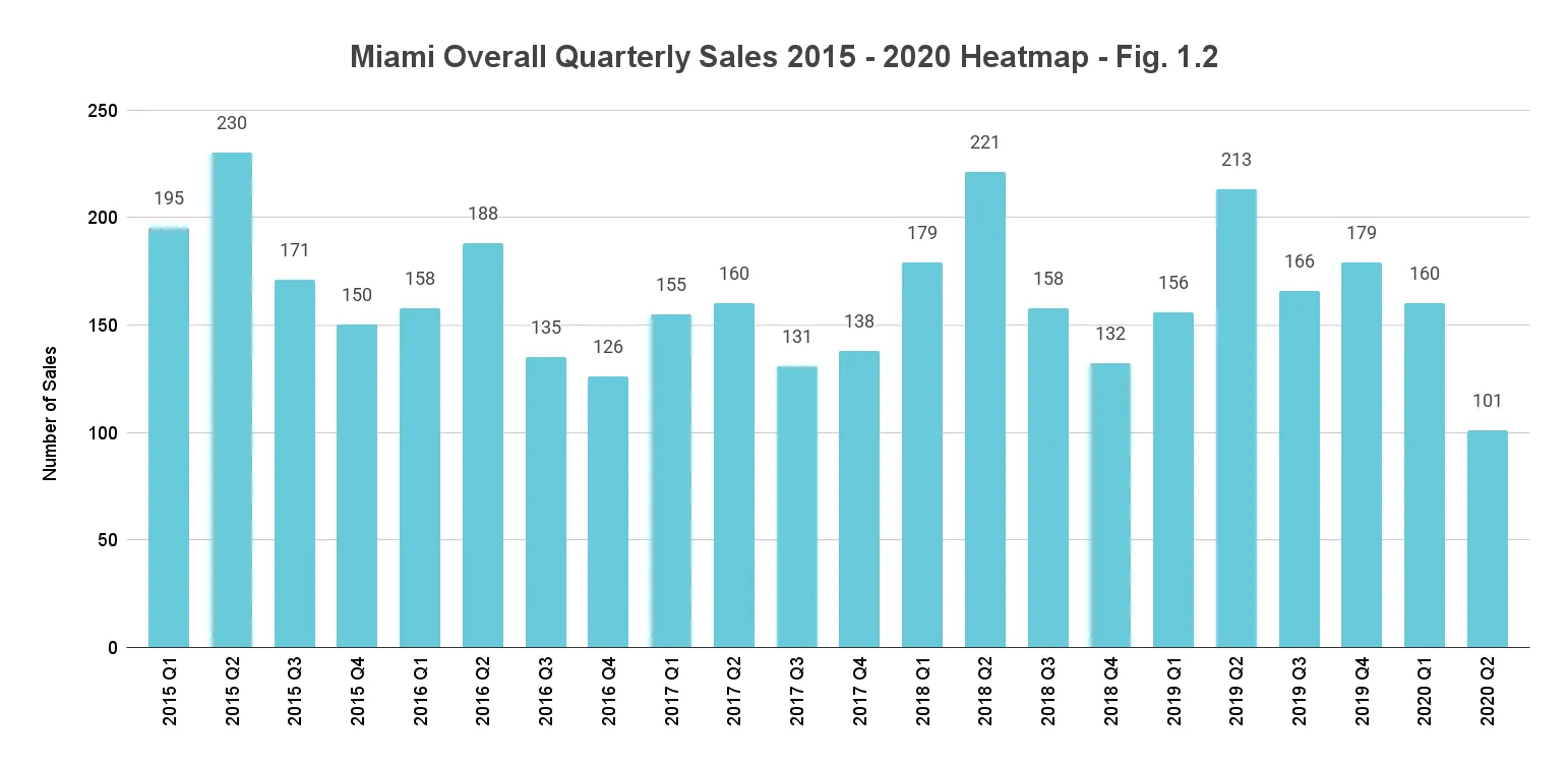 Sales decline 52.6% year-over-year (expectedly) with negative trendline. As the COVID-19 situation unfolded worldwide during the first quarter, CondoBlackBook's quarterly luxury condo market report showed no signs of a negative impact on sales in Miami. In fact, analysis even pointed towards a healthier second quarter, since it is usually the strongest of any given year and 2019 ended on a very strong note (Fig. 1.2). But as the city went into lockdown during March and April, it was natural to expect a decline in numbers even as virtual showings and closings took over.