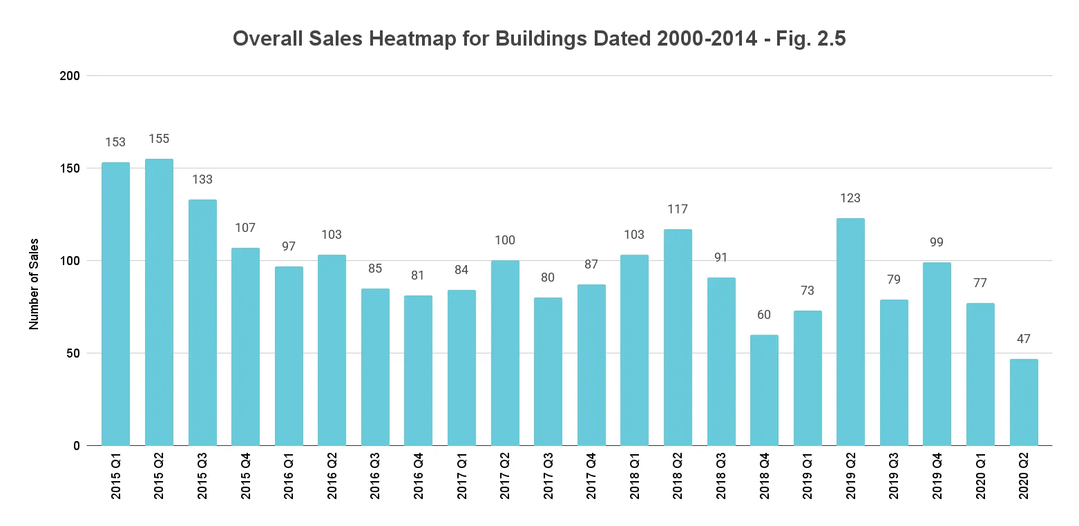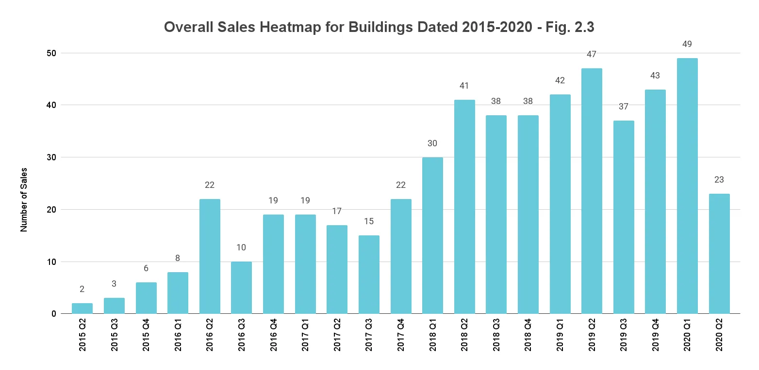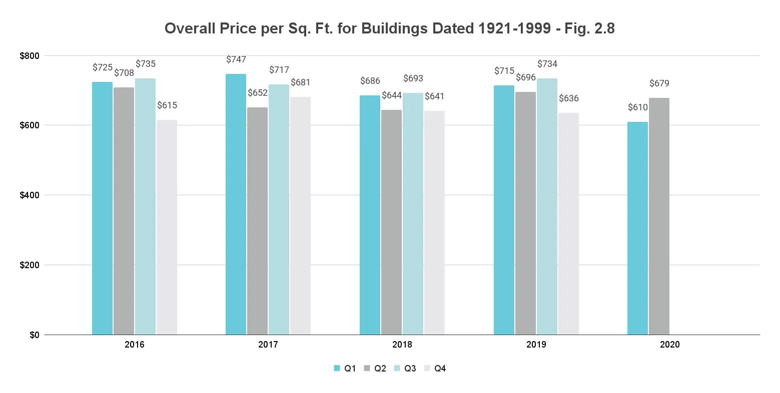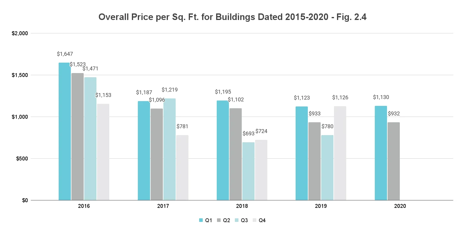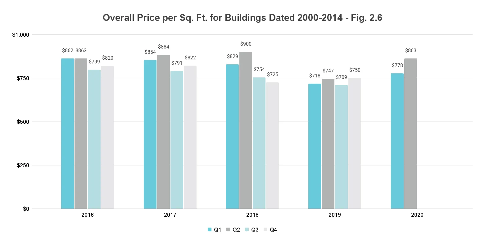 Inevitably, sales dropped for these new construction buildings over the second quarter of 2020. This newly built segment posted a 53% decline over the previous quarter and 51% decrease year-over-year (Fig. 2.3). Nonetheless, the median price per sq. ft. remained stable year-over-year with only a 17.5% decline seen quarter-over-quarter. At $932/sq. ft., the price trends in the mid-range of median prices traced over the past five years (Fig. 2.4).