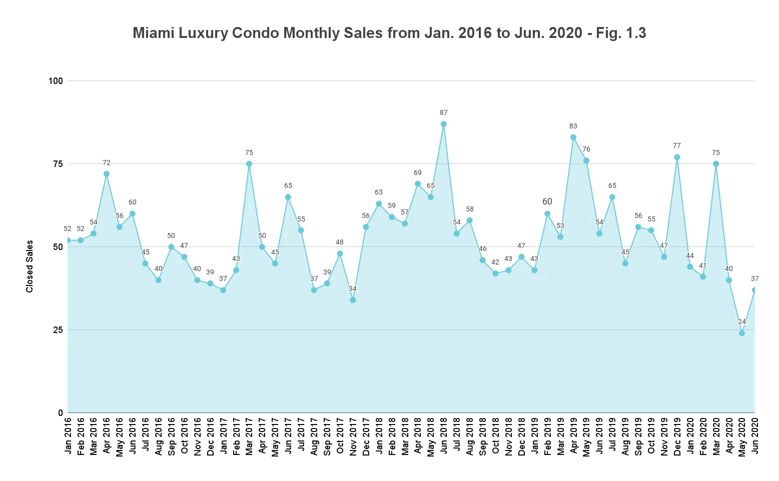 As expected, the market has reported a 52.6% decline in year-over-year sales for Q2 2020 (Fig. 1.1). A look at the monthly sales chart in Fig. 1.3 shows how, after peaking in March to 75, sales gradually dropped to 40 in April and 24 in May. However, a closer look reveals that numbers started rising back up to 37 sales in June as the city adjusted to the "new normal" of doing business. Pent up demand is making its way back to the market, and as of July, we can safely report that the luxury condo market is still very active.
