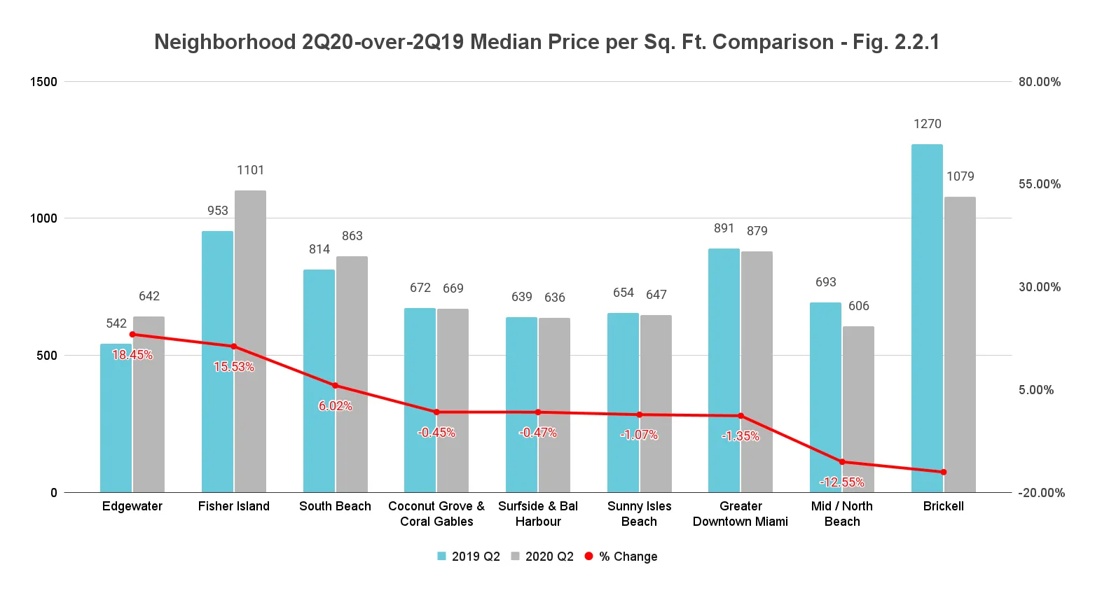 - Fisher Island re-emerges as the most expensive neighborhood in 2Q20 with a Median Sales Price of $1,101/sq. ft., followed closely by South Beach priced at $1,079/sq. ft.