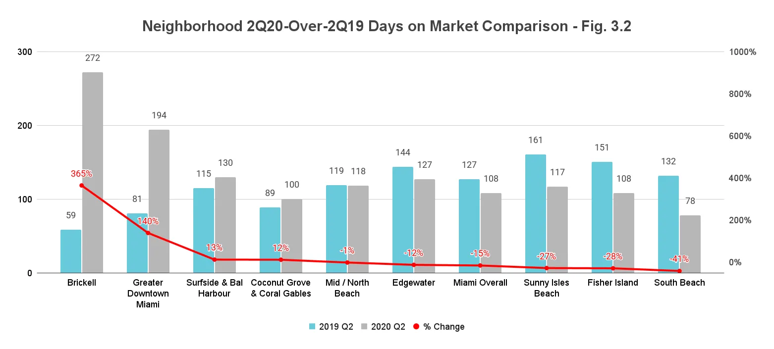 - Brickell reports the highest increase of 213 days of all the neighborhoods in our study. The business district reports a 361% increase, taking the metric up to 272 days on market this second quarter