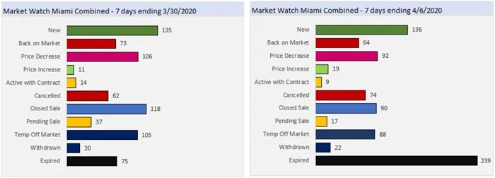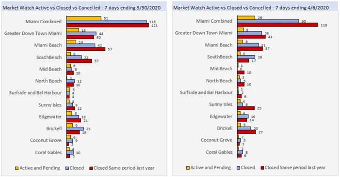 Similarly, there were a total of 51 Miami condos either “Active with Contract” or “Pending Sale” for the week ending March 30th, which shows that people are still buying. At the end of last week, that combined total decreased to 26. However, that doesn’t necessarily indicate that buyers are pulling out. These numbers are reminders that buying homes is an essential service, and we should expect to continue to see buyers and sellers coming to agreements and condo sales closing.