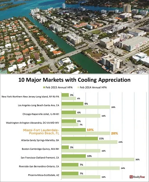 The markets of Miami, Fort Lauderdale, and Pompano Beach experienced a 10% rise in home prices in February, compared to last year. The rise was twice that much at 20% the year before.
