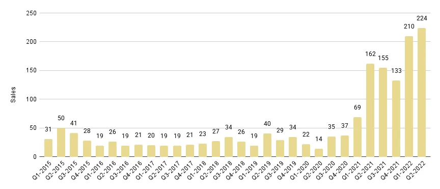 - Q2 2022 vs Q2 2021. Sales increased 38.3% year-over-year, up from 162 in Q2 2021 to an incredible 224 sales in the same quarter of 2022. (Fig. 1)