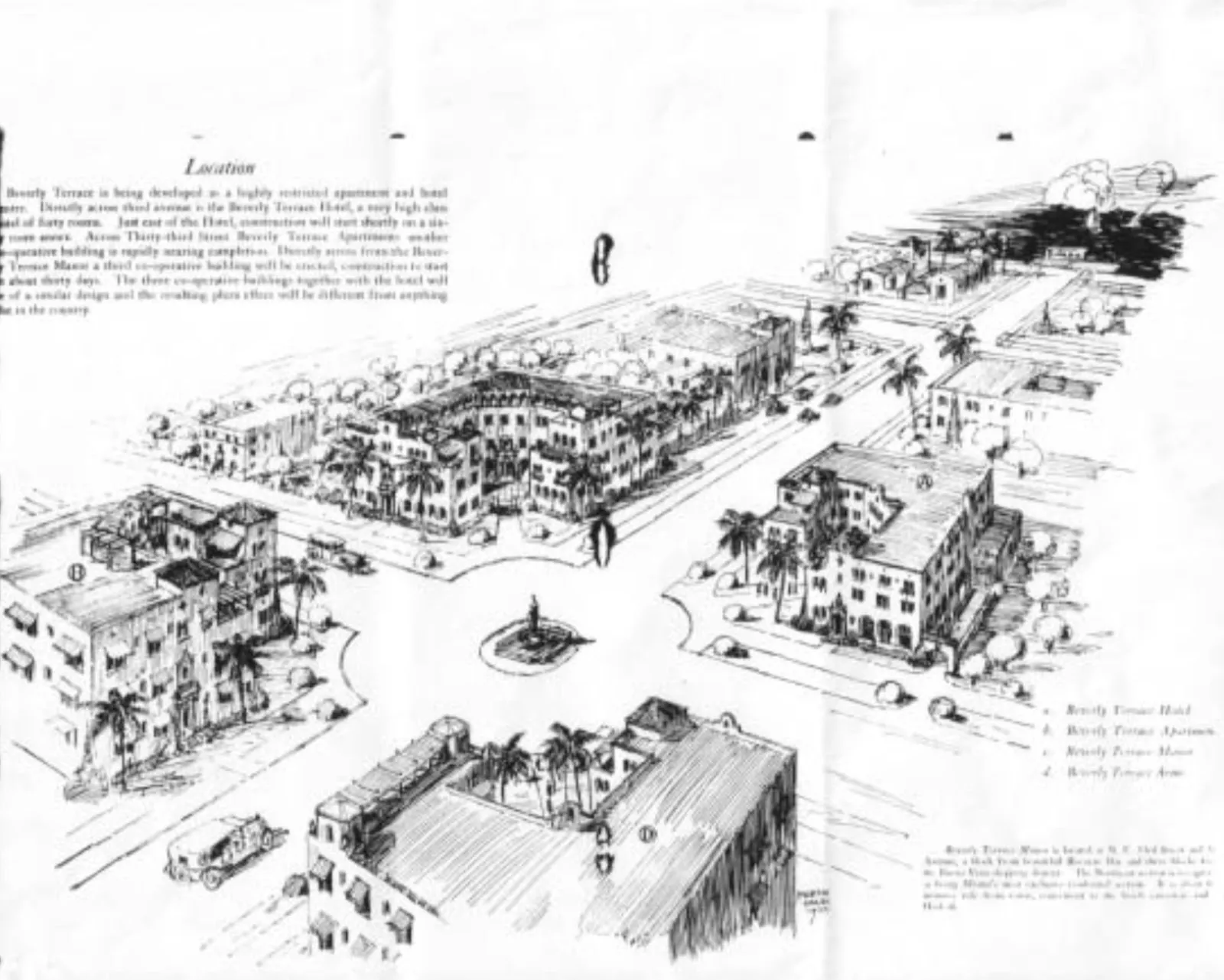 Each building appeared similar to the others at first glance but was architecturally unique, with details that set them apart. The fourth building and the fountain were never built, and the third building was demolished in later years. The two remaining, now known as the Beverly Terrace Historic District, are both apartment buildings. Interestingly, according to a Miami Daily News article of the time, the Beverly Terrace buildings represented the first example of co-op apartments in Florida.