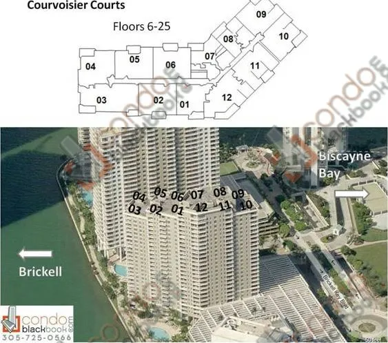 **Courvoisier Courts Condo in Brickell Key** Courvoisier Courts Condo in Brickell provides many elegant choices: 272 residences with one, two and three bedrooms as well as two-story penthouse apartments. All floor plans offer architecturally distinctive living spaces, gourmet kitchens and European cabinetry. There are spacious grand master suites, ceiling heights ranging from nine to thirteen feet, large balconies and sweeping vistas of the city and of the bay. From the moment you arrive on the island, to your first glimpse of Courvoisier Courts Condo, you'll be impressed at the vast array of luxury amenities we have to offer. From the broad, palm-lined avenues to the unique shops and restaurants you'll realize immediately just how special Courvoisier Courts on Brickell Key really is!Some Features are: World-class health and recreation facilities include a luxurious two-story Athletic Club, squash, racquetball, and croquet courts, resort-style sundeck, swimming pool, and hot spa all with spectacular views of downtown Miami and Biscayne Bay. A fully equipped Business center with conference room is available to all our residents, Concierge services ,Valet parking ensures you save time, and have the "helping hand" you may need with packages or parcels. Storage lockers are available .Unique Penthouse suites crown Courvoisier Courts in Brickell! Many to choose from -- all spectacular open-spaces bordered by panoramic views of blue sky and ocean! .Gourmet kitchens with state-of-the-art, General Electric appliances and fine, built-in, European cabinetry ,13' ceilings in some floor plans, Washers and dryers, linen closets and pantries complete each apartment.