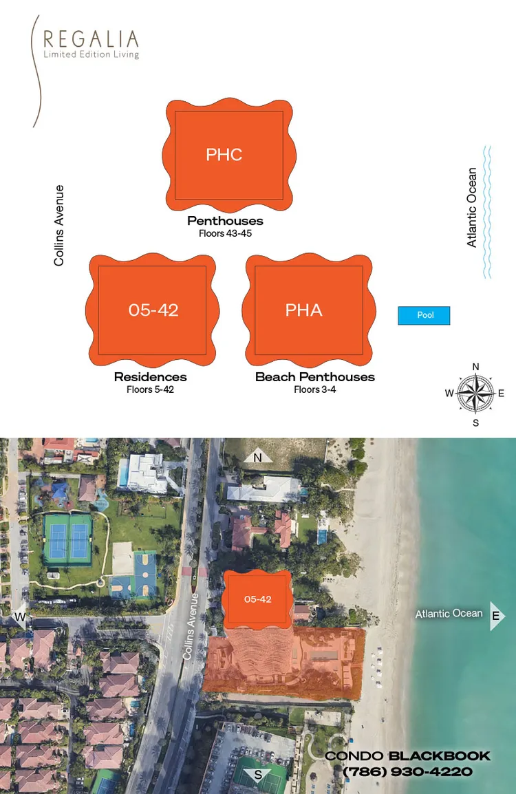 Regalia comes perfectly positioned on the serene white-sand shores of Sunny Isles Beach. The nearest Publix is less than a mile away. The extensive shopping and dining options of Aventura Mall are an 11-minute drive away, while the upscale finds of Bal Harbour Shops are 20 minutes away. A 35-minute car drive can deliver one to the Fort Lauderdale-Hollywood International Airport as well as South Beach, while the Miami International Airport is 45 minutes away.