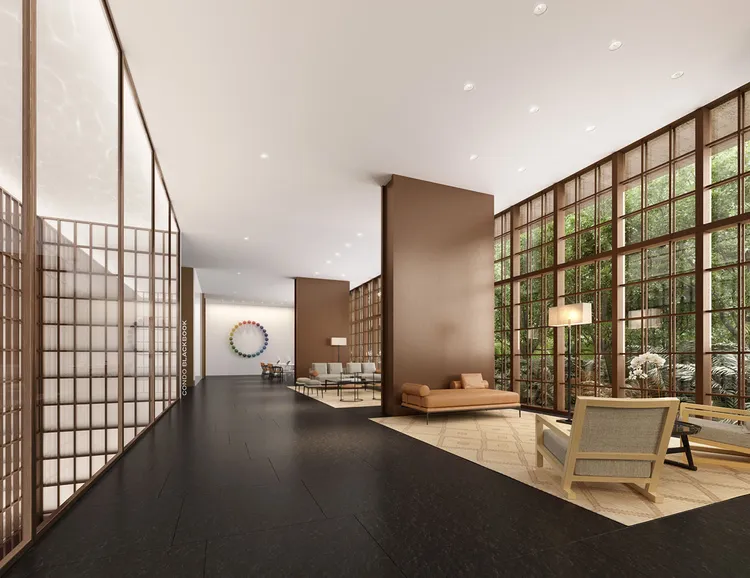 Each of the Arte homes have been designed to capture the best of ocean and city views through their gridded bronze Schüco window system. Built with the Mediterranean way of life in mind, the building uses richly veined Roman travertine as its signature material, as well as bronze-colored accents and resort-style amenities designed to promote stress-release, such as a meditation pond, a yoga studio and more.